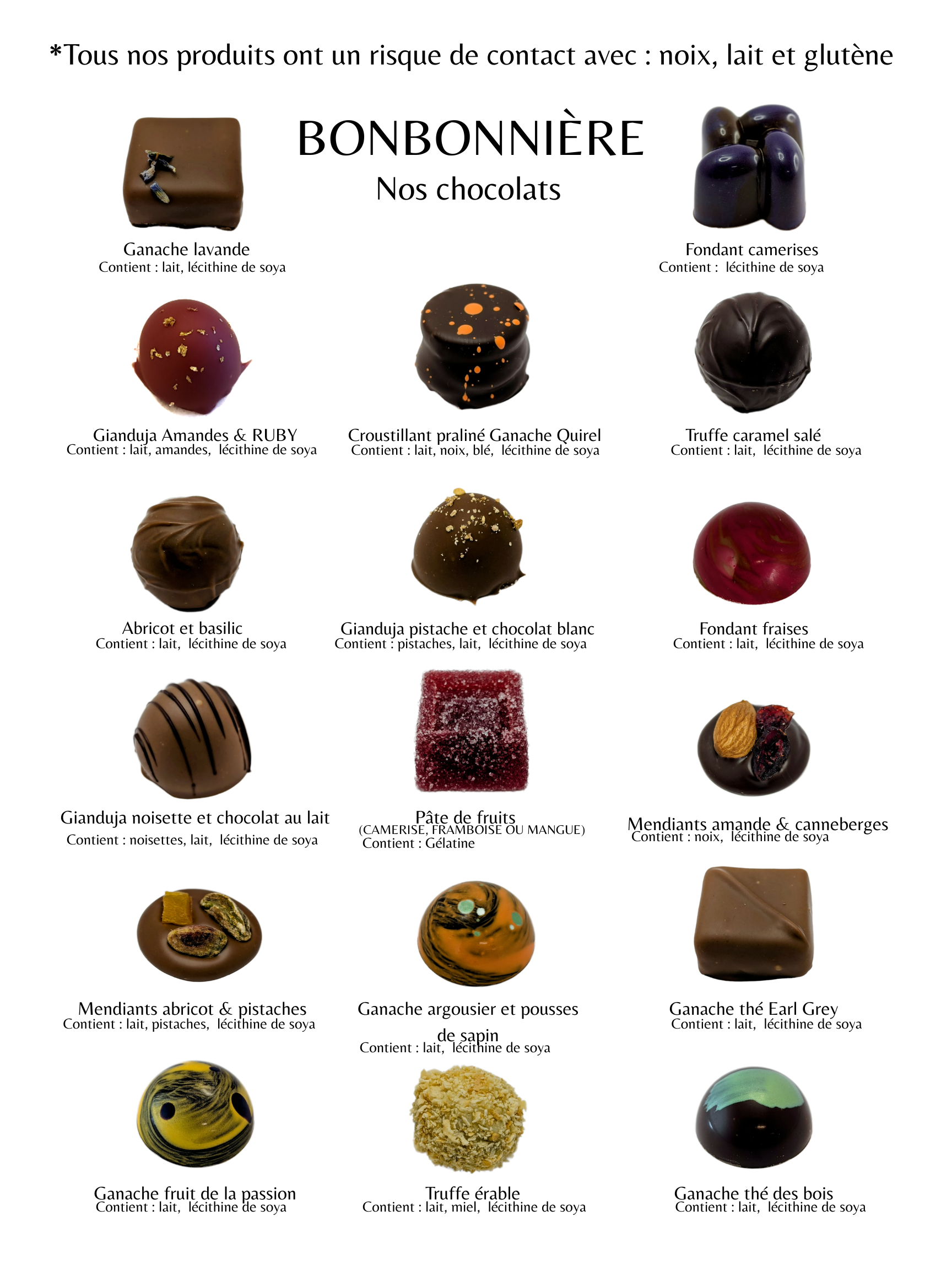 *Les chocolats se conservent au frigo trois semaines et contiennent ou peuvent contenir des noix, du lait et de la lécithine de soja.